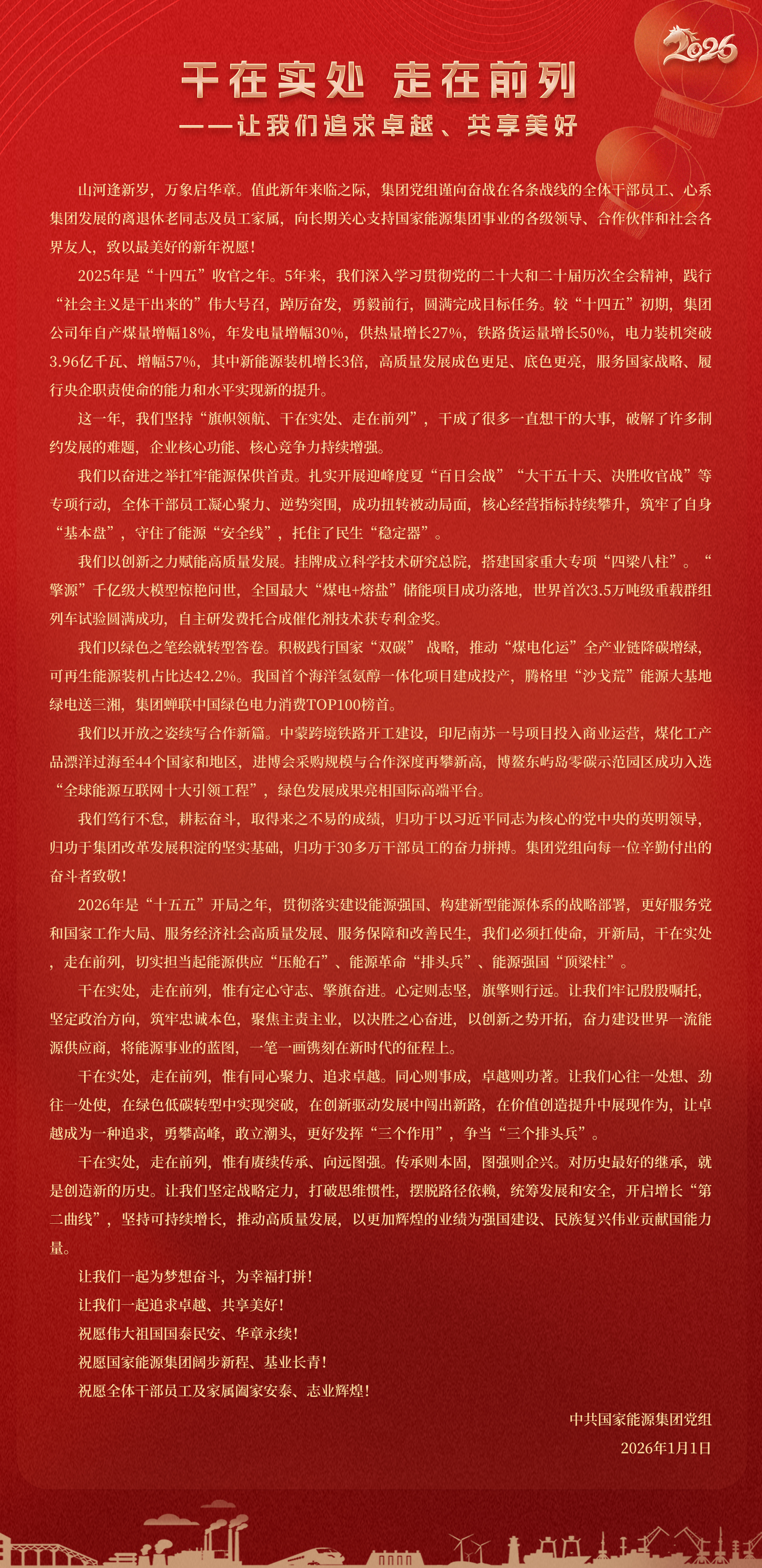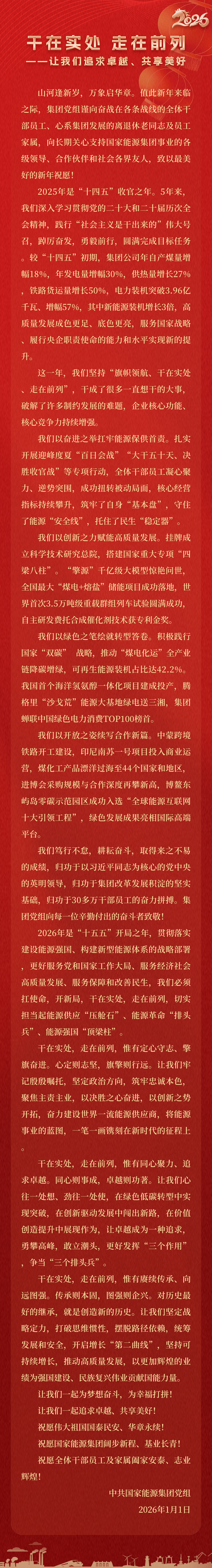 國(guó)家能源集團(tuán)胸懷“國(guó)之大者”,增產(chǎn)增供、穩(wěn)價(jià)穩(wěn)市,積極服從服務(wù)國(guó)家戰(zhàn)略、保障國(guó)家能源安全、助力國(guó)民經(jīng)濟(jì)穩(wěn)增長(zhǎng),推動(dòng)煤炭安全綠色智能、煤電清潔高效穩(wěn)定、現(xiàn)代煤化工高端多元低碳、運(yùn)輸物流協(xié)同一體、新能源多元?jiǎng)?chuàng)新規(guī)?;l(fā)展,全力擔(dān)當(dāng)能源強(qiáng)國(guó)頂梁柱,能源供應(yīng)壓艙石,能源革命排頭兵。